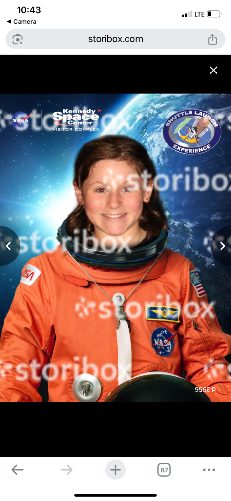 On the weekend we went to Kennedy space centre and we became astronauts! We saw a really real rocket take off!!!!!!!! It was awesome, we had space lunch, wore space suits and went on a space shuttle simulation. This is me in a space suit.