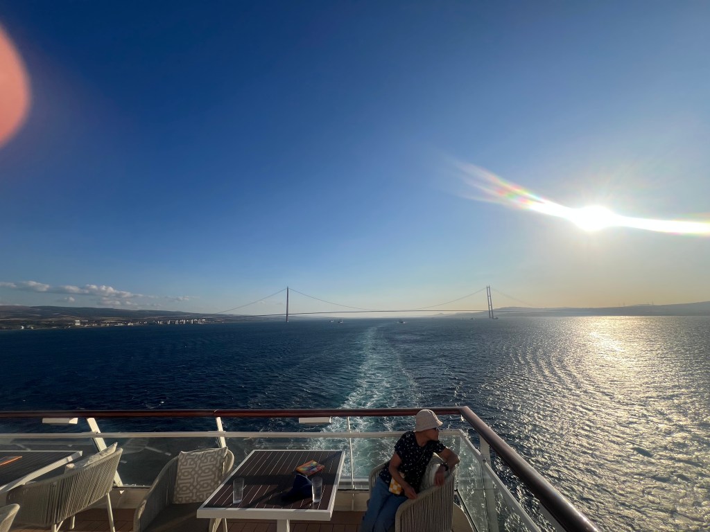 The Canakkale 1915 Koprusu Bridge – Opened in 2023, this is the longest Suspension Bridge in the World at 2,023m long. It celebrates 100 years of the modern Turkish state and an Ottoman naval victory in WW1. The Gallipoli Peninsular on the right in these pictures from the back of the ship. Anzac Cove is on the other side of the Peninsular.