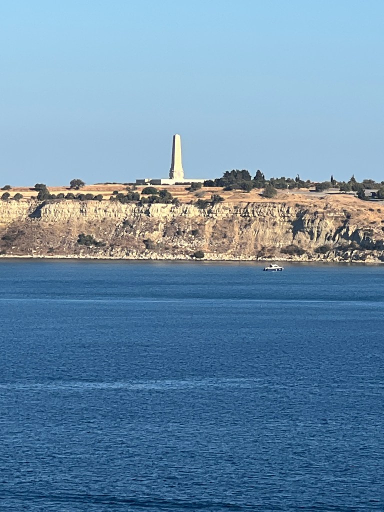 Got up just in time to see the two WW1 memorials at the entrance into the Dardanelles: