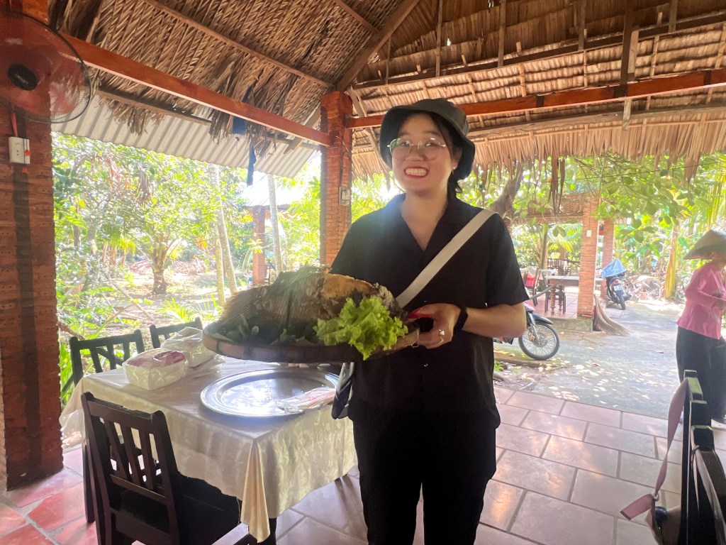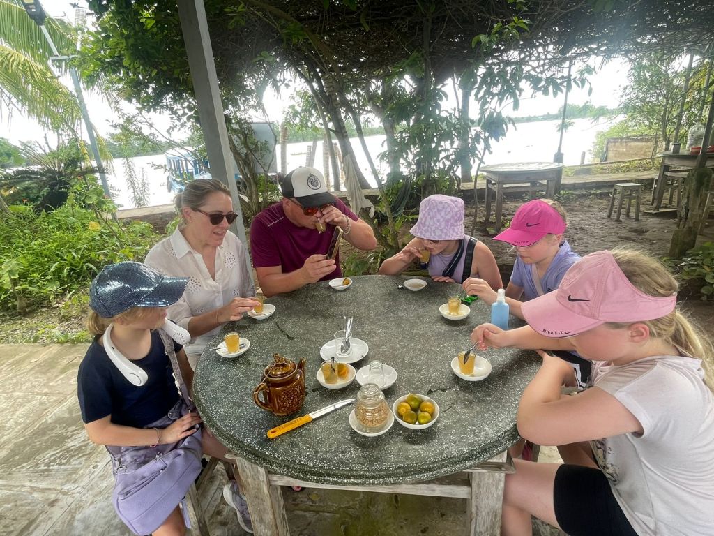 Eventually we arrived at the Mekong Delta Tourist Boat drop off point. The usual collection of specially priced hats, t-shirts, Labubus and pocket knifes where thrust in our faces on the way to the happy room. Feeling happier, we jumped on a really new Mekong Tourist Taxi Boat, strapped into another Decathlon life jacket (King Kong size) and set off for the quickest of quick-fire food safaris.